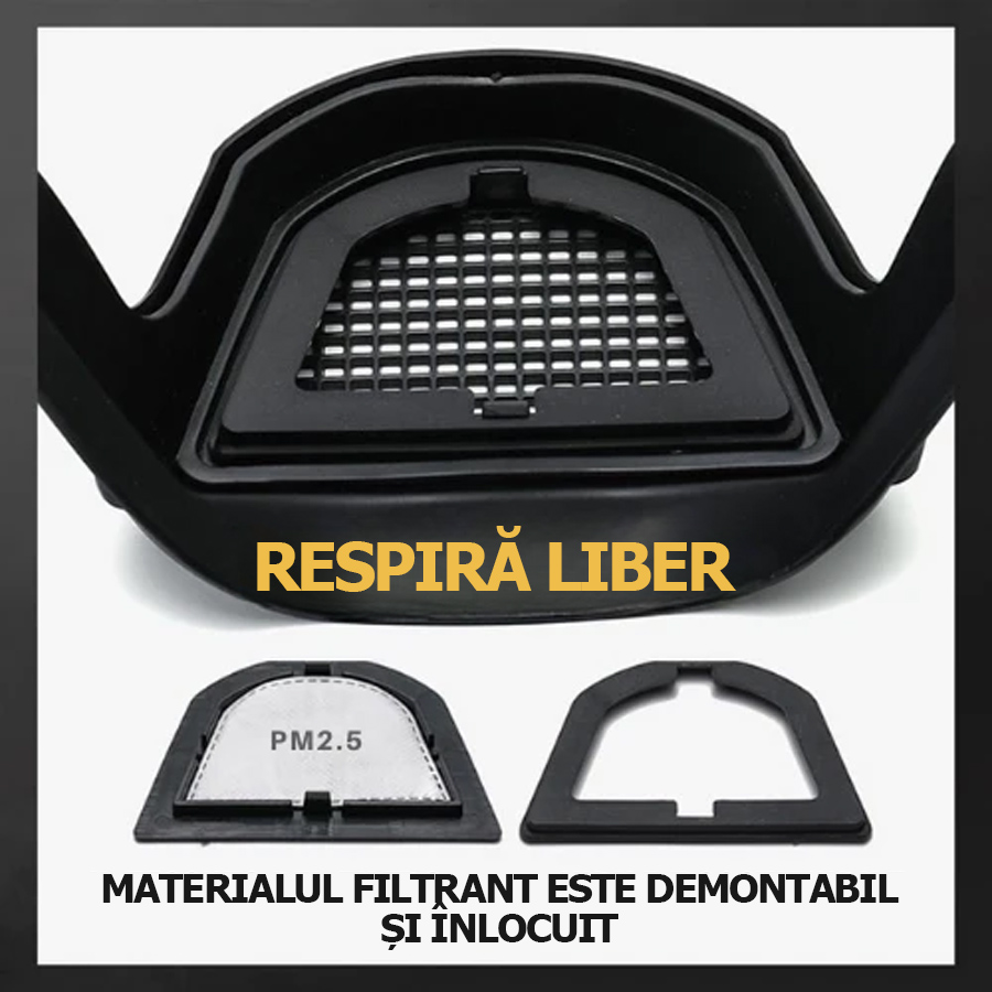 Sub bărbie se află o zonă respirabilă căptușită cu un covoraș filtrant, pe care îl puteți înlocui cu material textil sau bumbac.