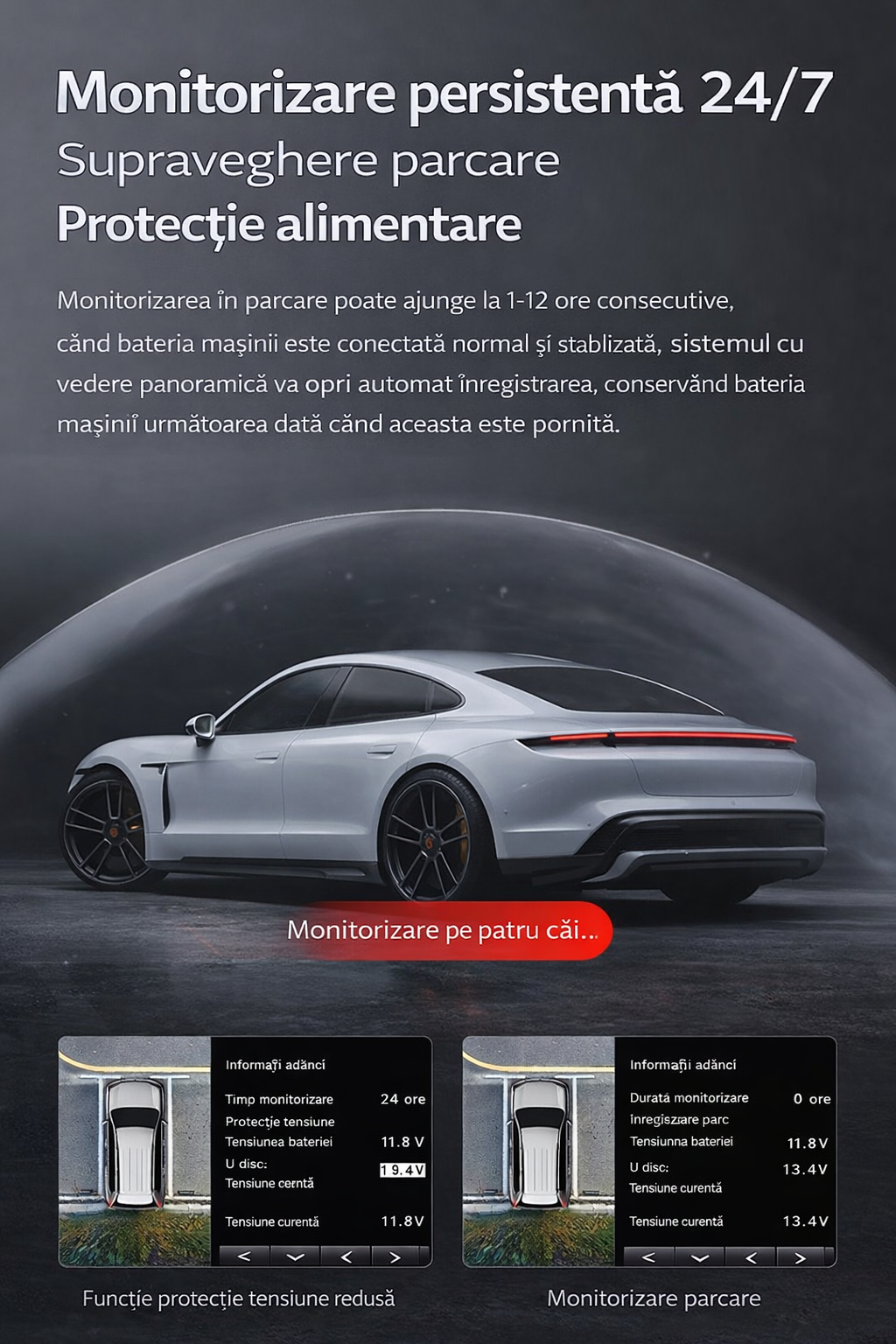 🔋 Protecție inteligentă pentru baterie · Monitorizare parcare 24/7